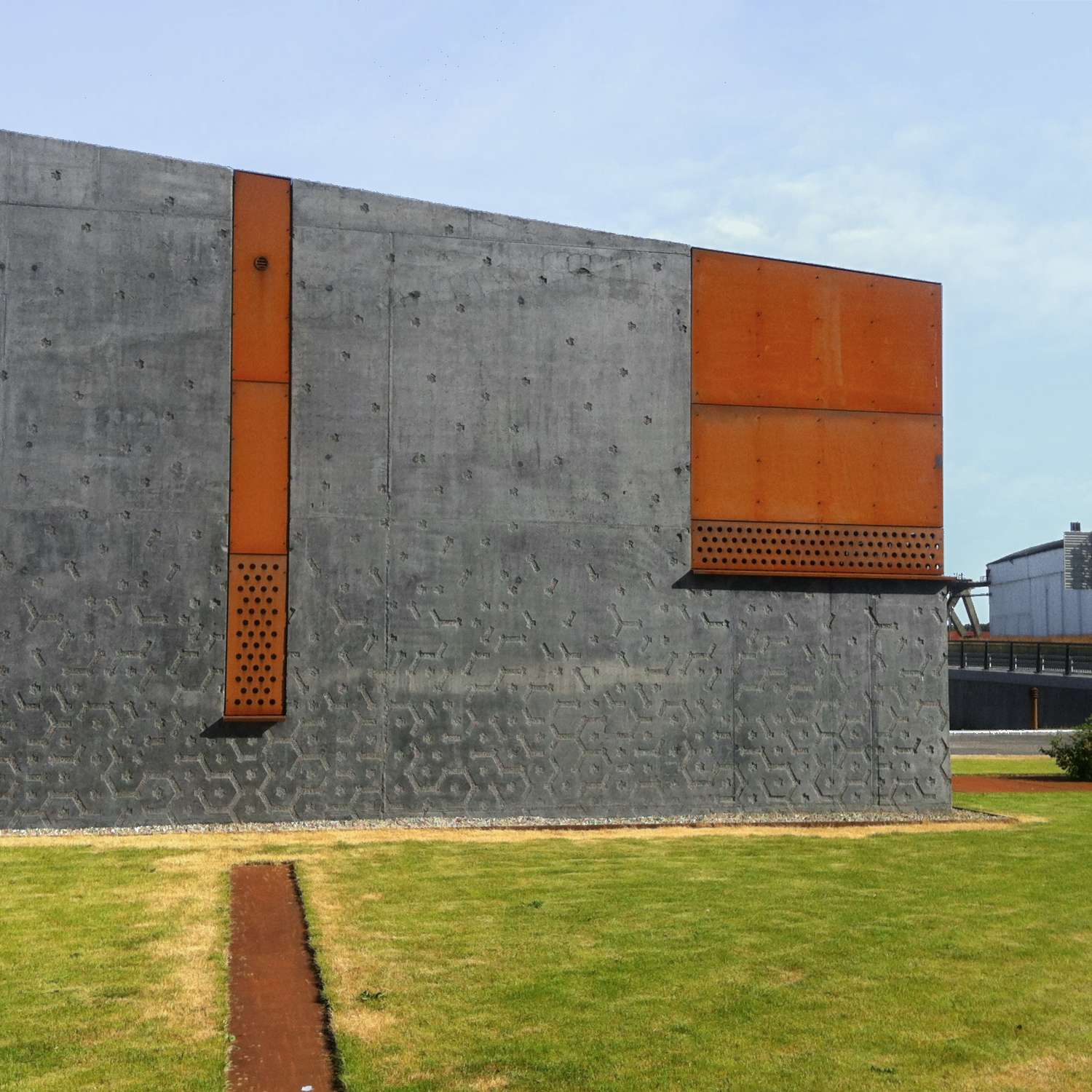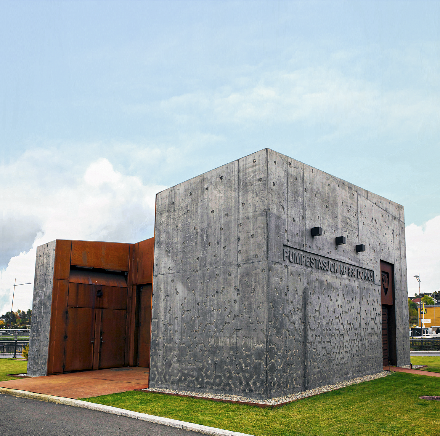 Byggest øverste og eneste synlige etasje er utformet i plasstøpt betong og cortenstål. Mønster av vannmolekyler er sandblåst inn i betongflatene. Byggverket har ytterligere 3 etasjer under bakken fylt med teknikk og pumper og er et av Fredrikstads viktigste knutepunkt for vann og avløp.